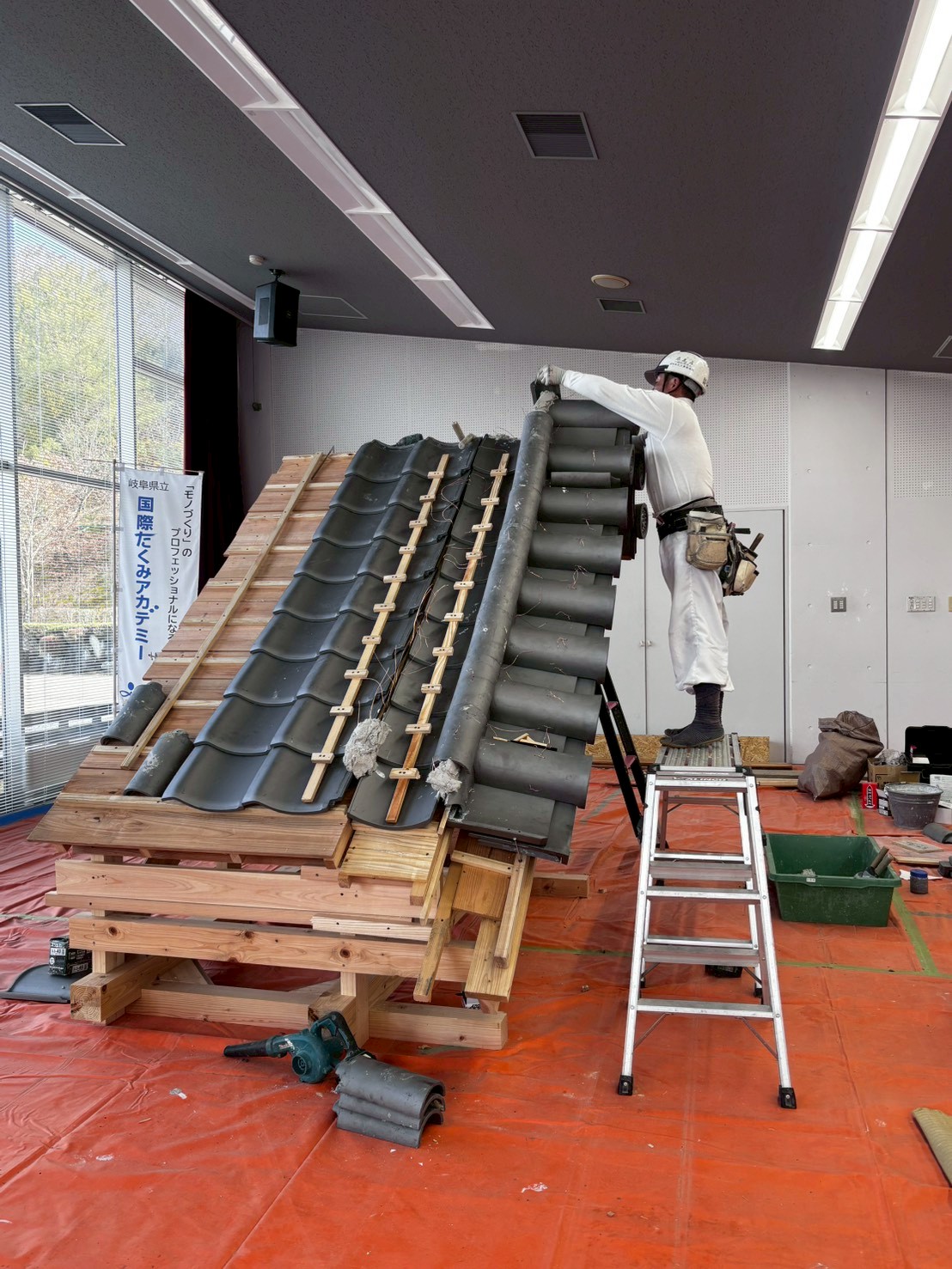 例年行われる向上訓練では多くの会員さんが参加されています。実技では本掛け箕甲の納まりの施工と壁際出隅の納まりの施工法、敷瓦の納まり施工法を行いました。特殊な瓦屋根の施工は瓦葺き職人の腕が立つ施工です。瓦葺き職人と言っても、この難しい施工は全員が出来るわけではありません。高度な技能と技術をこの向上訓練で学びます。